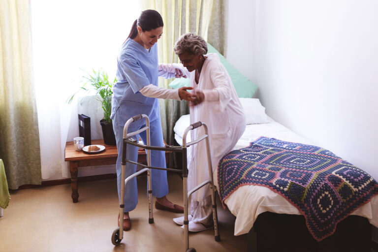 Helping an aging senior stand up requires a gentle and supportive approach.